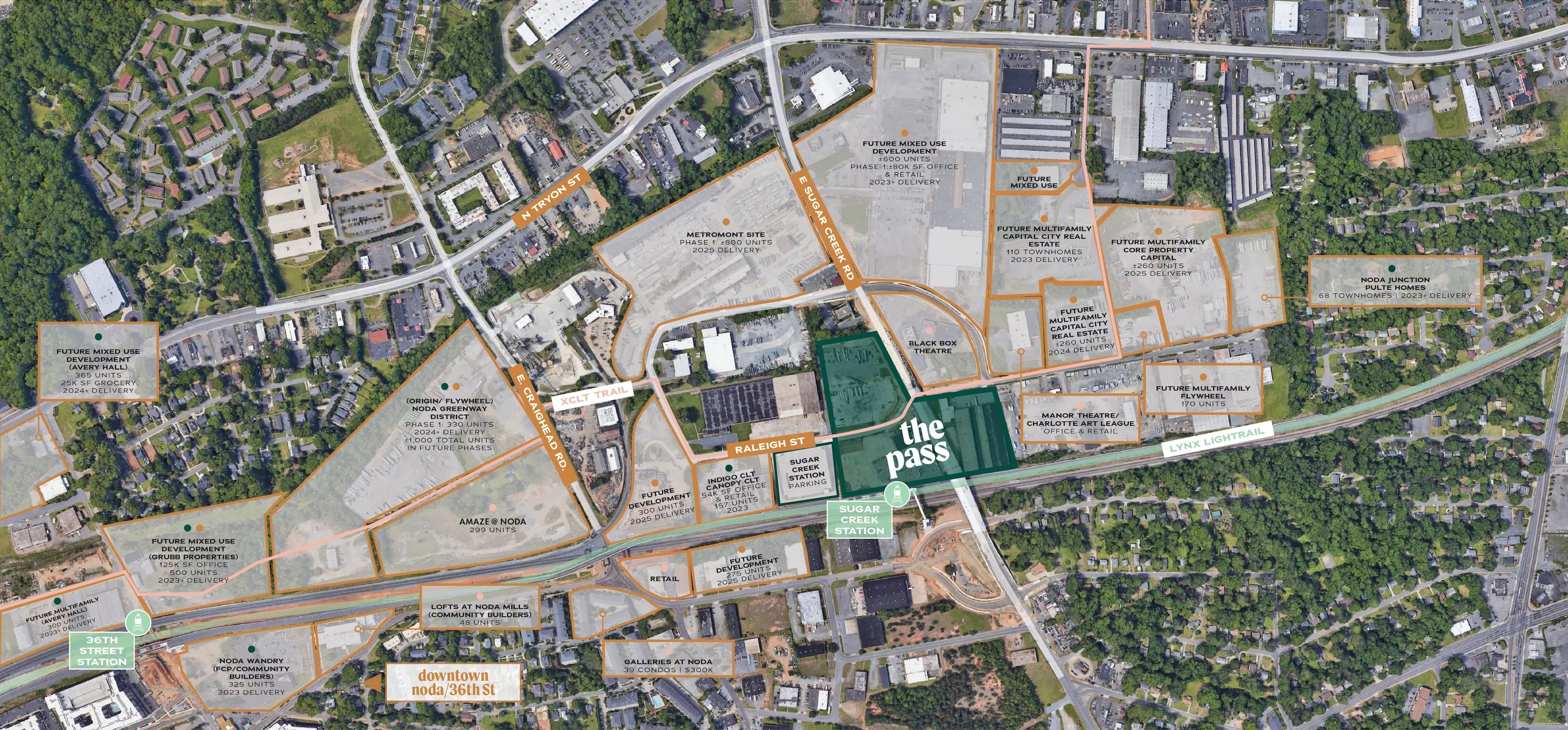 The Pass is located in the bustling NoDa submarket, which is Charlotte's historic arts district and has some of the best retail in the city. Deejai Thai, Great Wagon Road Distillery and others are located just across the light rail from The Pass. Additionally, The Pass is located one light rail stop away from 36th Street Station in NoDa, so you are within minutes of well-known food and beverage options such as Cabo Fish Taco, Jeni's Ice Cream, Heist Brewery, Goodyear House, and more!